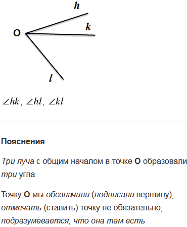 Начертите три луча h, k и l с общим нача­лом. Назовите все углы, образованные дан­ными лучами.