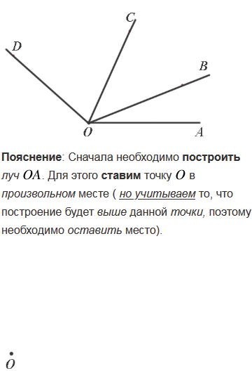 Начертите луч OA и с помощью транспортира отложите от луча OA углы AOB, AOC и AOD так, чтобы