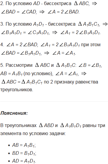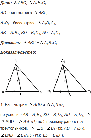 В треугольниках ABC и A1B1C1 отрезки AD и A1D1 - биссектрисы, AB = A1B1, BD = B1D1 и AD =A1D1. Докажите, что