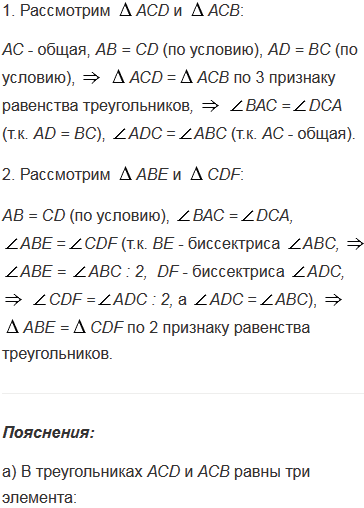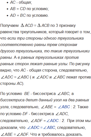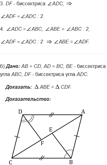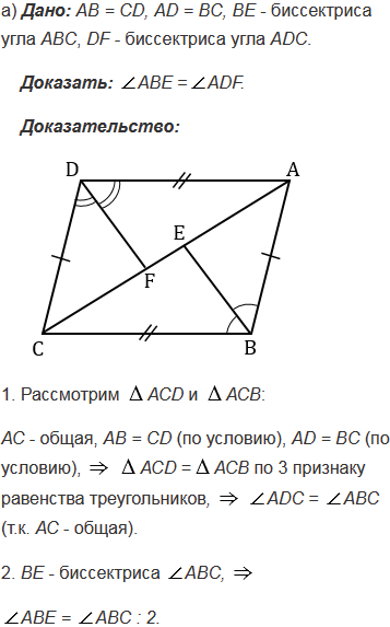 На рисунке 82 AB = CD, AD = BC, BE - биссектриса угла ABC, а DF - биссектриса угла ADC. Докажите, что: