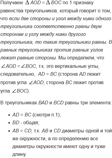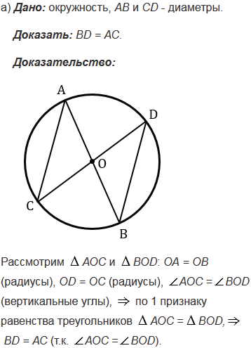 Отрезки АВ и СD - диаметры окружности. Докажите, что: а) хорды ВD и АС равны; б) хорды АD и ВС равны; в)