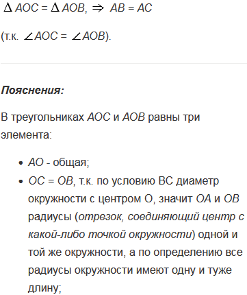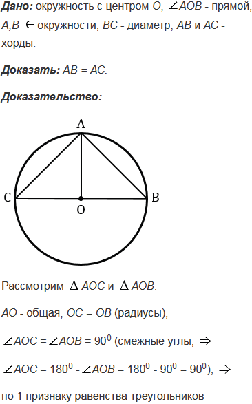 На окружности с центром О отмечены точки А и В так, что угол АОВ - прямой. Отрезок ВС - диаметр окружности. Докажите, что хорды АВ и АС равны.
