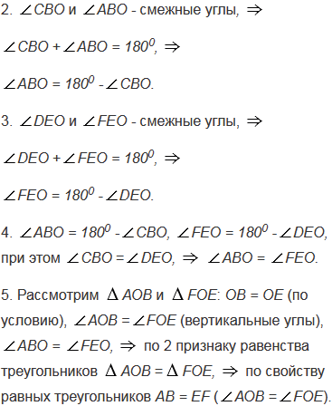 На рисунке 95 ОС = OD, ОВ = ОЕ. Докажите, что АВ = ЕF. Объясните способ измерения ширины озера (отрезка АВ на рисунке 95), основанный на этой задаче.