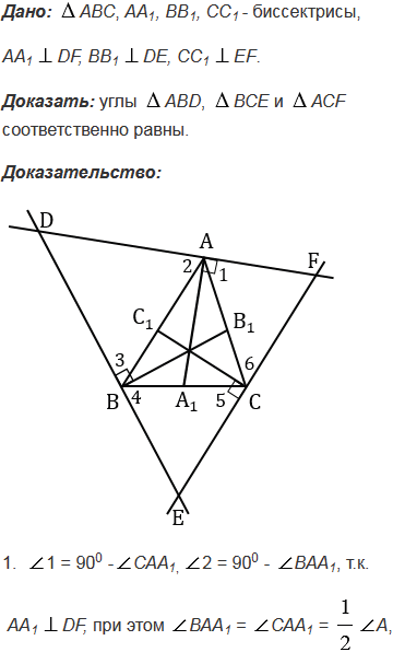 Через каждую вершину данного треугольника проведена прямая, перпендикулярная к биссектрисе треугольника, исходящей из этой вершины. Отрезки этих прямых вместе со сторонами данного треугольника образуют три треугольника. Докажите, что углы этих треугольников соответственно равны.