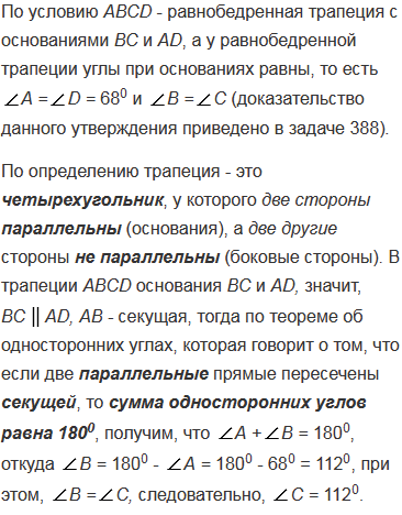 Один из углов равнобедренной трапеции равен 680. Найдите остальные углы трапеции.