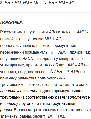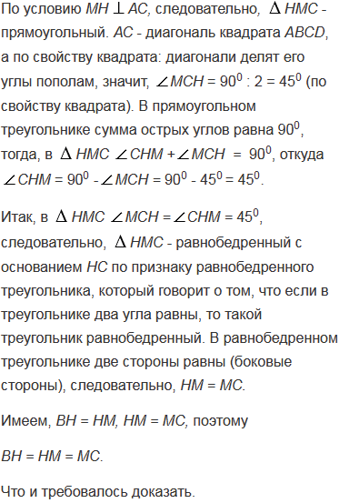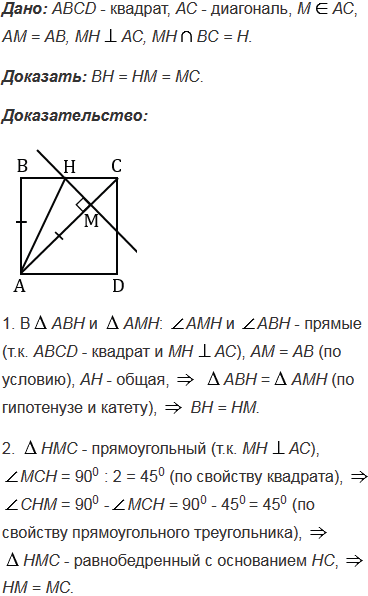 На диагонали АС квадрата АВСD взята точка М так, что АМ = АВ. Через точку М проведена прямая, перепндикулярная к прямой АС и пересекающая ВС в точке Н. Докажите, что ВН = НМ = МС.