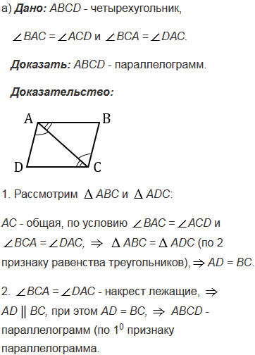 Докажите, что выпуклый четырехугольник АВСD является параллелограммом, если: а)