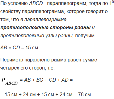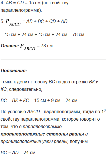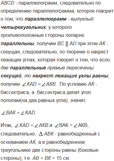 Биссектриса угла А параллелограмма АВСD пересекает сторону ВС в точке К. Найдите периметр этого параллелограмма, если ВК = 15 см, КС = 9 см.