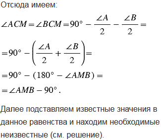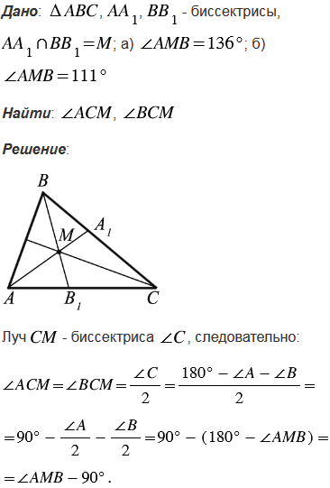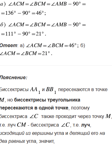 Биссектрисы АА1 и ВВ1 треугольника АВС пересекаются в точке М. Найдите углы АСМ и ВСМ, если: а)