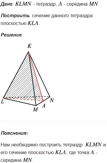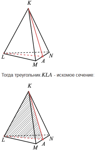 Постройте тетраэдр KLMN и постройте сечение этого тетраэдра плоскостью, проходящей через ребро KL и середину А ребра MN.