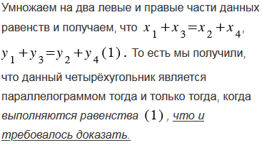 Вершины четырёхугольника ABCD имеют координаты A(x1; y1), B(x2; y2), C(x3; y3) и D(x4; y4). Докажите, что этот четырёхугольник является параллелограммом тогда и только тогда, когда x1 + x3 = x2 + x4 и y1 + y3 = y2 + y4.